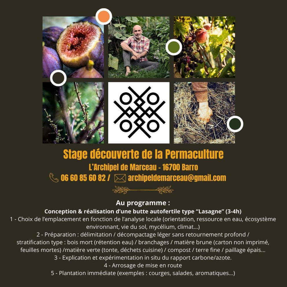 Des stages à vivre. Un lieu à ressentir. Une expérience qui transforme.L'Archipel de Marceau propose des stages pour se former à la permaculture, aux plantes sauvages comestibles et médicinales ou encore à l'apiculture douce.Le temps d'une demi-journée, d'une journée entière ou même en restant une nuit sur place, seul ou en famille, venez (re)découvrir les secrets de la Nature !Les thématiques :L’autonomie et les low-techs
